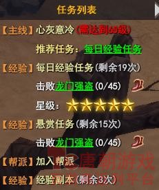 日常任务主要包括每日经验任务,悬赏任务,经验副本任务,银两副本任务,材料副本任务等等,日常任务每天0点重置,可获得大量经验,银两,材料等等游戏内道具。