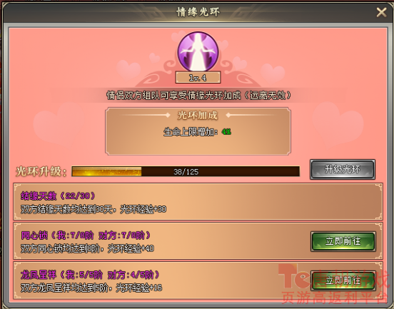 情缘光环可通过双方结缘天数、同心锁阶数、龙凤呈祥阶数的提升来获取光环经验