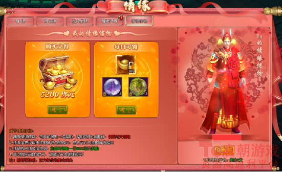 消耗5200元宝即可为情缘购买情缘信物,信物持续7天,除购买当天可领取5200绑元外,每日还可领取999绑元以及三生石*3、龙凤丹*3