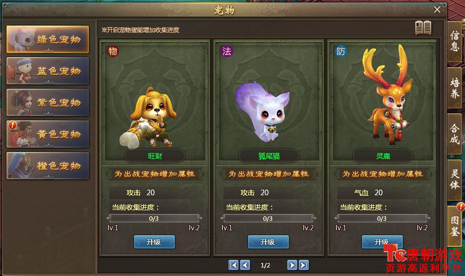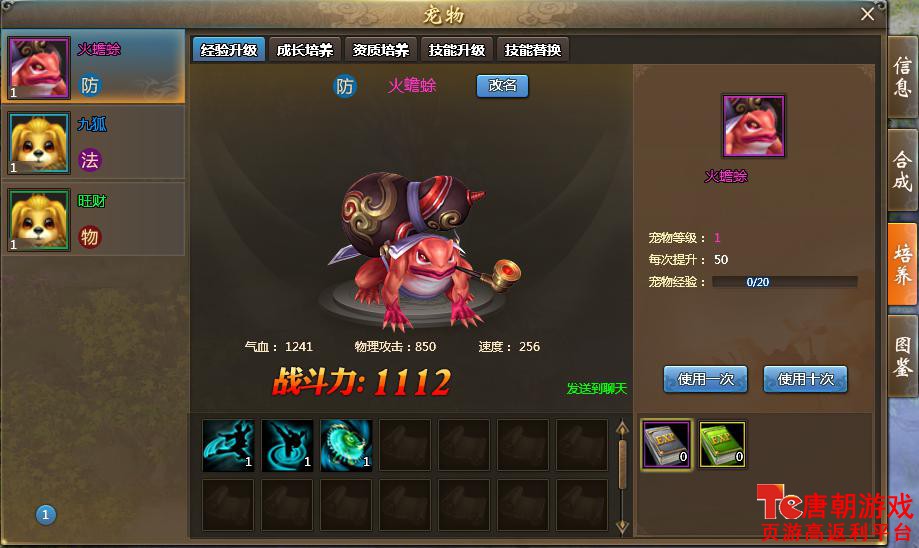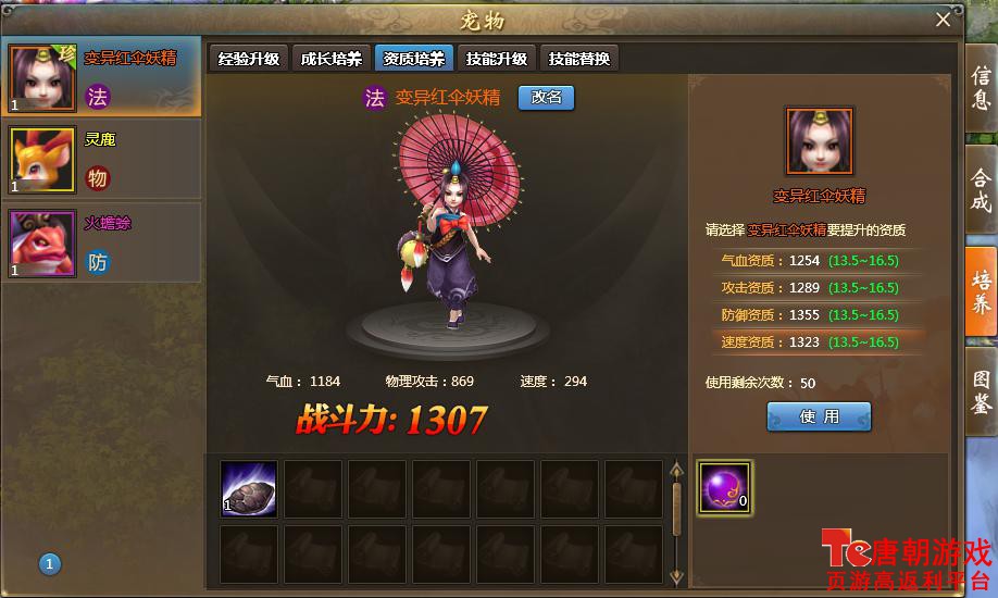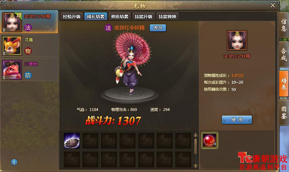 成长培养:通过消耗成长丹可以提升宠物的属性,每只宠物限制使用50次成长丹。