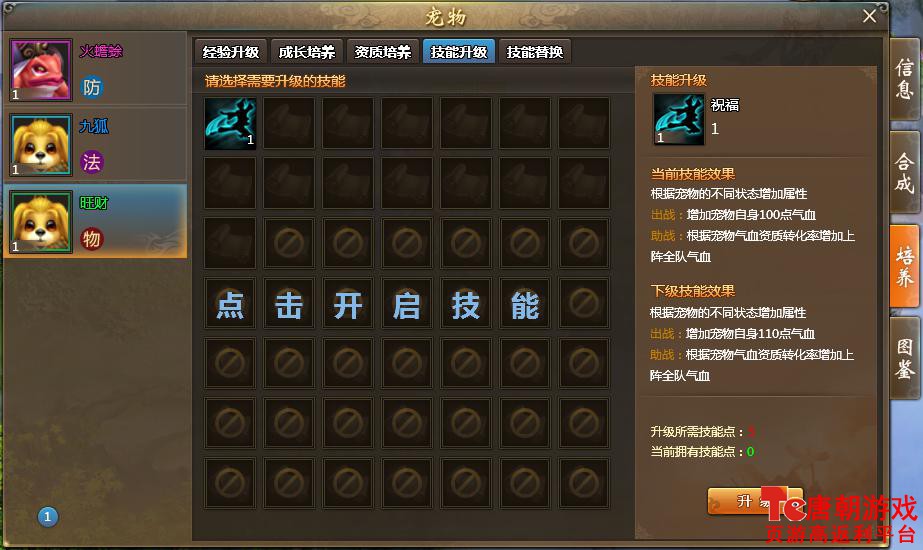 玩家可以通过消耗技能点来升级宠物当前所拥有的技能,技能点来源于宠物放生、技能书出售、技能成功顶替;