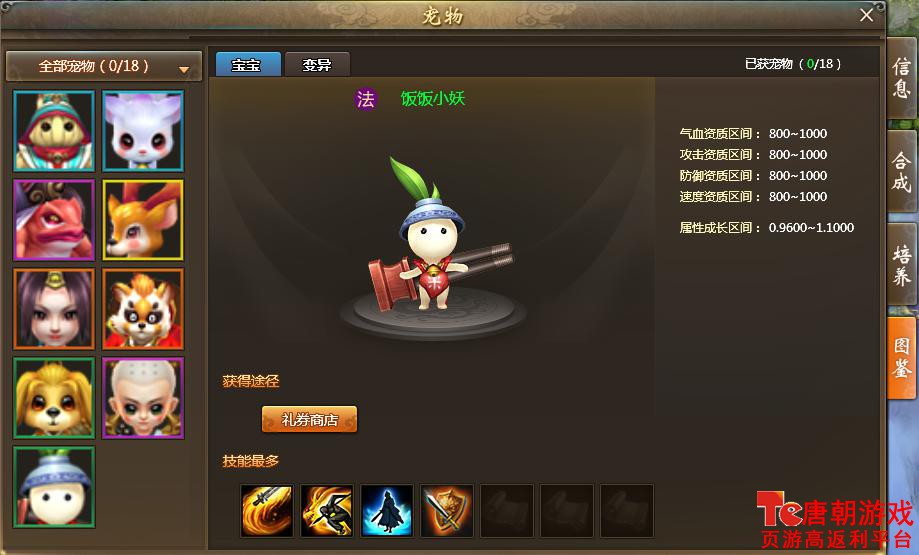 宠物技能:每个宠物至少有1条技能,每个宠物最多可携带4条技能,宠物技能可通过技能书、合宠获得