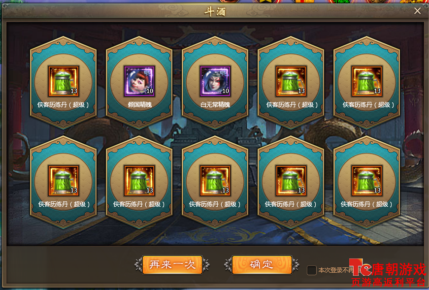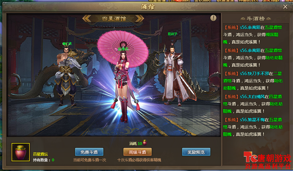 玩家可在不同等级的酒馆中通过消耗斗酒道具或元宝进行普通斗酒或高级斗酒(10连抽),每日还有一次免费斗酒机会