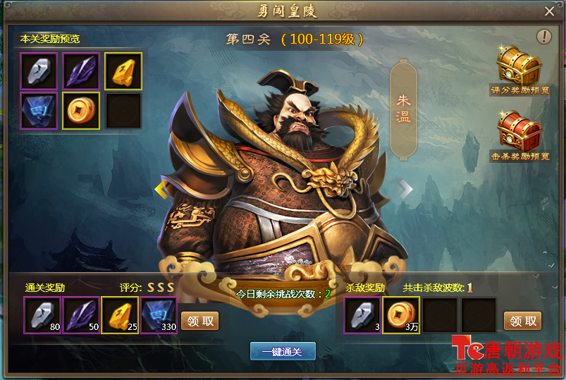 勇闯皇陵为车轮战玩法,击退每一波敌人均可获得奖励
