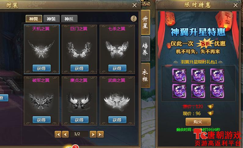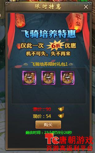 不同等级开启的特惠种类不同,分为坐骑训练特惠(可特惠价格购买坐骑训练丹礼包)、宝石特惠(可优惠价格购买宝石礼包)、飞骑培养特惠(可优惠价格购买飞骑培养丹)、时装特惠(含神装淬炼培养、神翼淬炼培养、神武淬炼培养等优惠物品)等等