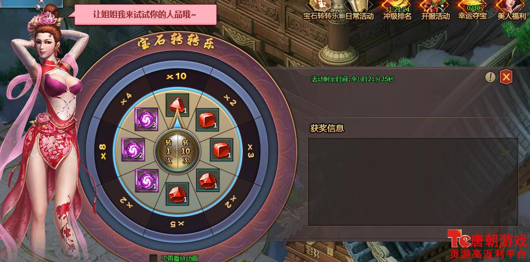 活动介绍:开服第一日开启宝石转转乐,消耗30元宝可转动1次,消耗300元宝可转动10次,每次转动必可获得数量随机的宝石礼包或宝石封灵珠奖励