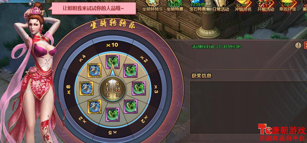 活动介绍:开服第二日开启坐骑转转乐,消耗30元宝可转动1次,消耗300元宝可转动10次,每次转动必可获得数量随机的坐骑训练丹或坐骑进化丹
