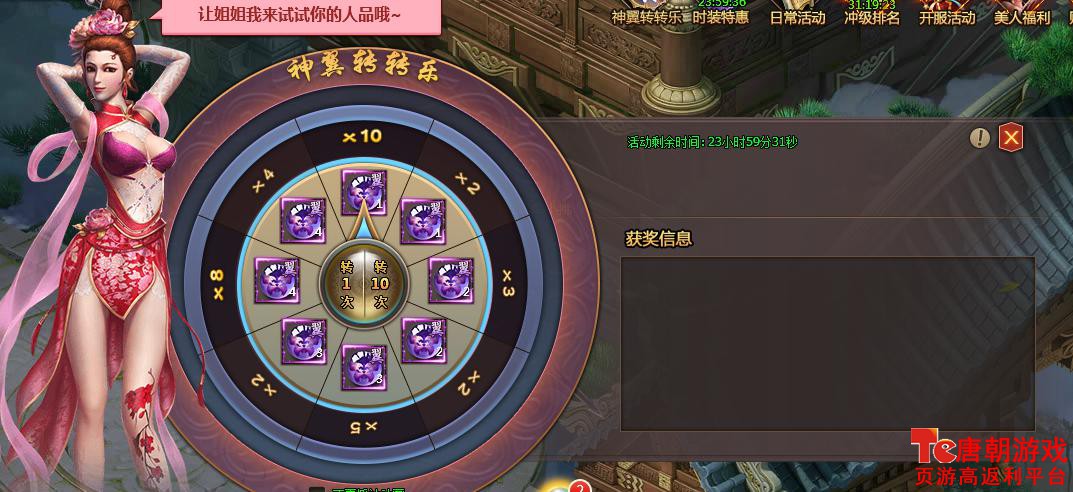 活动介绍:开服第三日开启神翼转转乐,消耗25元宝可转动1次,消耗250元宝可转动10次,每次转动必可获得数量随机的神翼淬炼丹