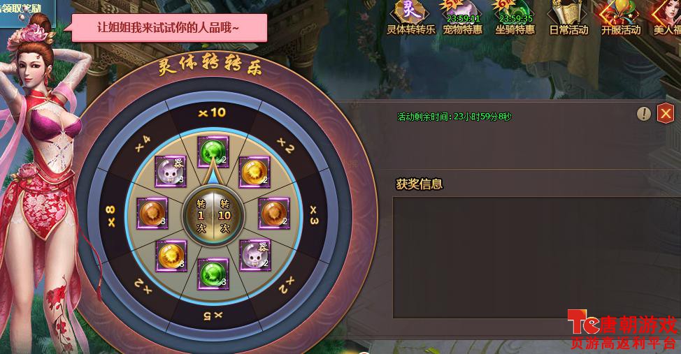 活动介绍:开服第四日开启灵体转转乐,消耗25元宝可转动1次,消耗250元宝可转动10次,每次转动必可获得数量随机的灵珠或灵器培养丹
