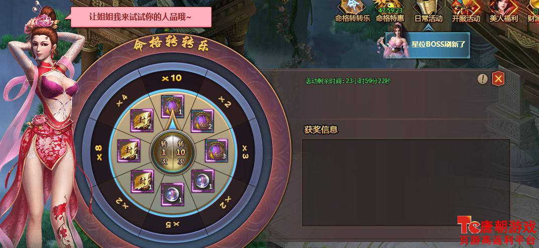 活动介绍:开服第五日开启命格转转乐,消耗90元宝可转动1次,消耗900元宝可转动10次,每次转动必可获得数量随机的命格礼包、命魂封印石或猎命珠