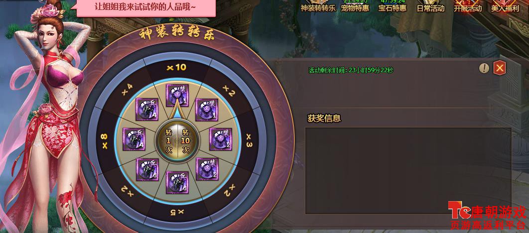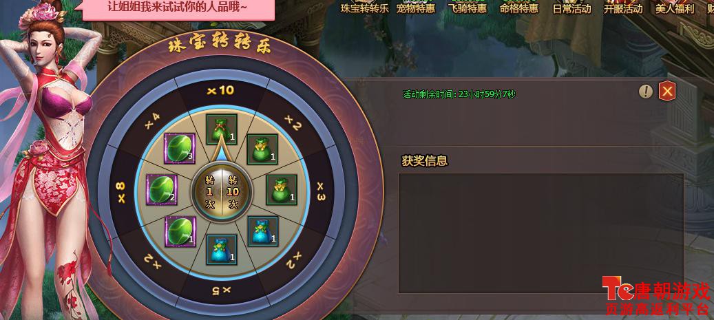 活动介绍:开服第六日开启珠宝转转乐,消耗30元宝可转动1次,消耗300元宝可转动10次,每次转动必可获得数量随机的珠宝礼盒或珠宝封印石