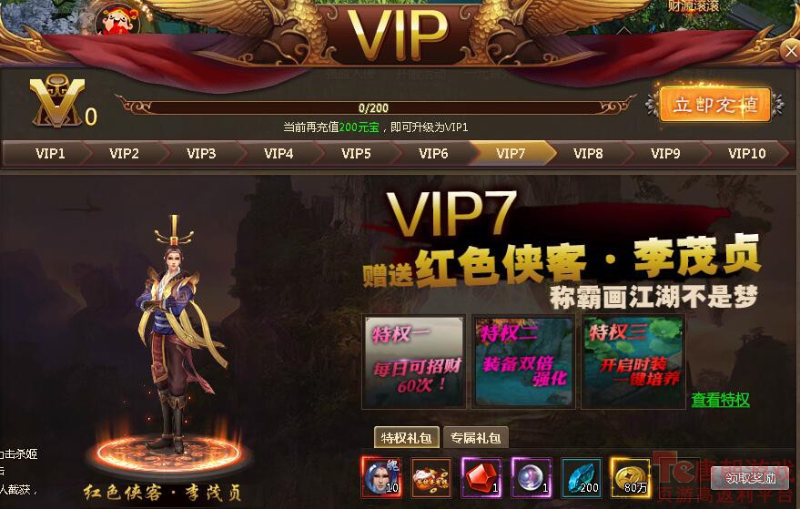 不良人VIP特权介绍,VIP等级越高玩家将会获得更多的游戏特权,游戏将会有更好的体验!如下图,玩家到达VIP7将会获的红色侠客——李茂贞以及各种特权。