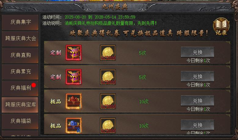 1、「庆典宝库」消耗庆典券,全服兑换指定道具,全服限量;