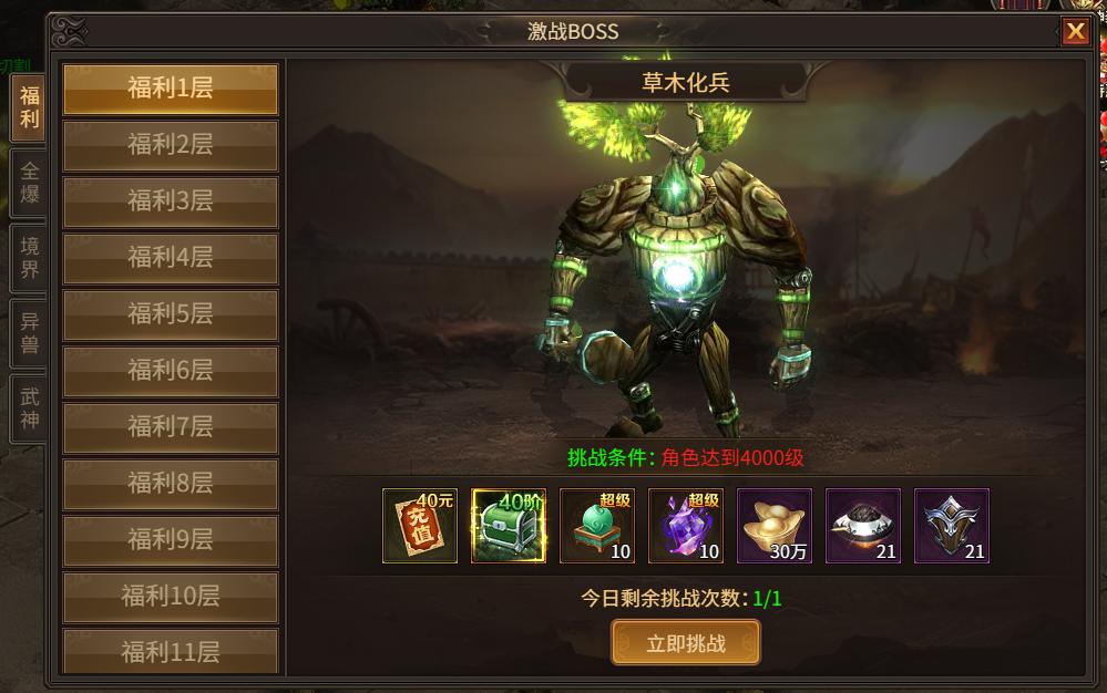 1.福利BOSS:每日仅可挑战一次,可获取大量充值卡及道具