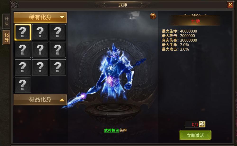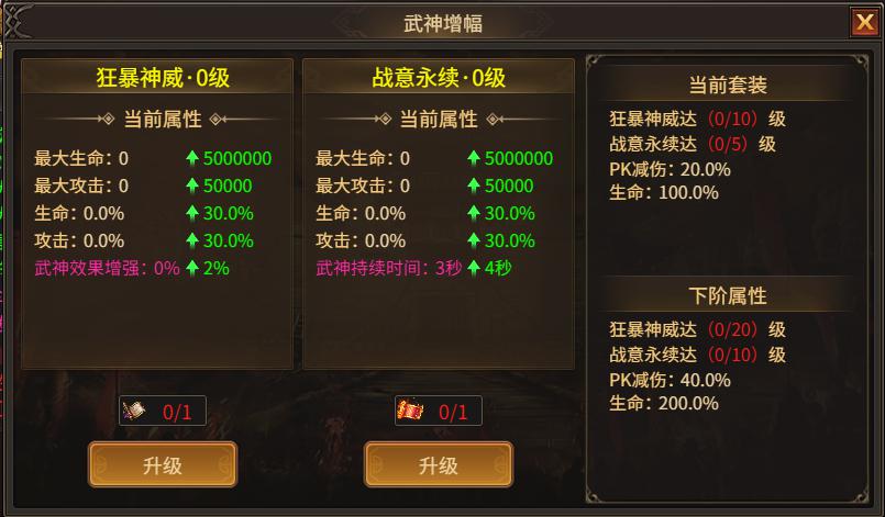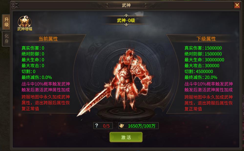 1.玩家可在武神页面激活武神,并持续升级,获得大量属性加成: