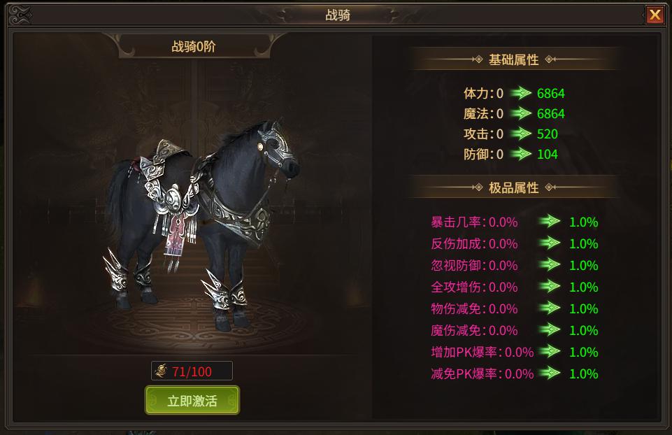 2.战骑提供大量基础属性加成,同时附带极品属性加成,可大幅提升角色战斗与PK能力。